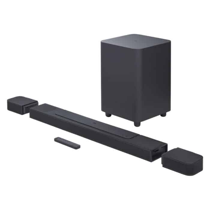 The JBL Soundbar 1000 price in Kenya is Ksh 97,000. Experience movies, music, and games with a sound that puts you center stage, thanks to a total output power of 880 W and impressive bass from the 10” subwoofer. The JBL Bar 1000 features MultiBeam and four up-firing drivers, two in the soundbar and two in the detachable, battery-powered surround speakers.