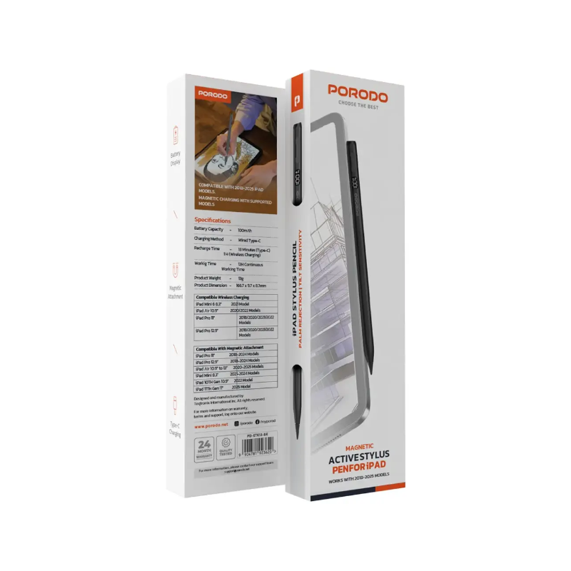 From the moment you pick it up, the Porodo Stylus Pen communicates quality through its clean finishing and sturdy construction. Its premium materials give it a reassuring weight—light enough for long writing sessions, yet solid enough to feel like a true productivity tool. The pen attaches magnetically to compatible iPads, providing both convenience and wireless charging without any cables. It becomes part of the tablet’s silhouette, ready to use the moment you need it, whether you’re sketching during a meeting or taking notes in class.
